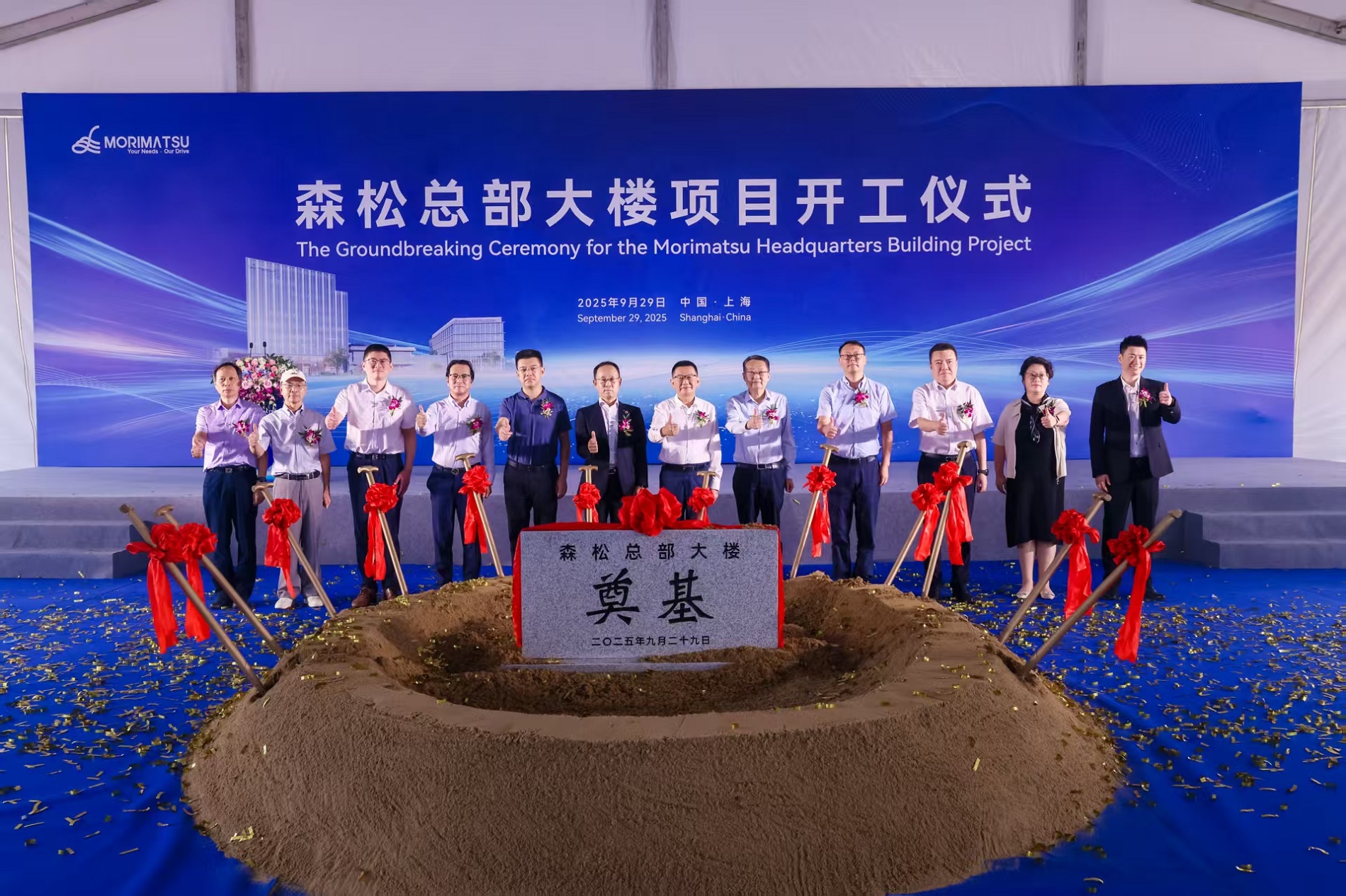 On the morning of September 29, 2025, the Groundbreaking Ceremony of the Morimatsu Headquarters Building Project was successfully held. This project's building area is 59778m2 including new building1#、2# and 3#. Construction period is 31 months. Building 1# and 2# are office buildings with 9 floors and 6 floors respectively. Building 3# is a commercial building with 3 floors. Structure type is steel frame+concrete corewall for building 1# and 2#; building 3# is steel frame structure. There is also a two-layer underground parking garage.